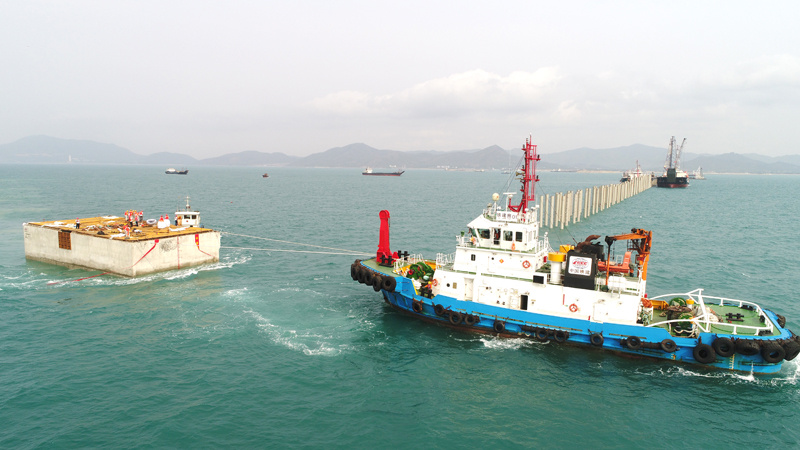 三亞新機場是國內首個海上機場項目,此次安裝的沉箱自重4068噸,采用C45高性能混凝土分4層澆筑。整個過程持續約26個小時,完成了包括氣囊充氣、移運到船、拖輪拖帶、衛星定位、注水下沉等工作環節。沉箱安裝穩定后,將向倉格內填砂,屆時整個沉箱重量將超過9600噸,以確保護岸結構整體穩定。該標段共需預制安裝超過4000噸的方形沉箱56個,最高的約21.5米,相當于8層樓高。